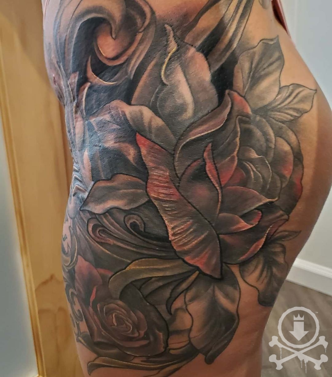 Jordancampbellart Filigree Skull Filigree Ornamental Decorative Skull Flower Flowers Floral Rose Roses Feminine Leg Thigh Flourishes Black And Grey Original Custom Tattoo Art Burlington Ontario Canada Canadian Artist Big Kahuna Tatt Shack
